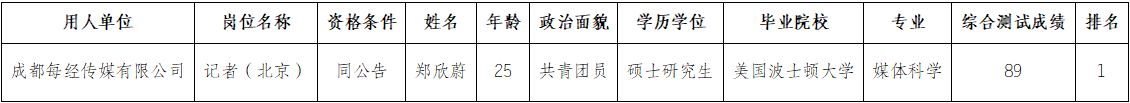 根据我司前期发布的招聘公告及招聘相关规定,经资格审核、面试、复试、背景调查、体检等程序,拟聘郑欣蔚为记者(北京),现将名单予以公示。